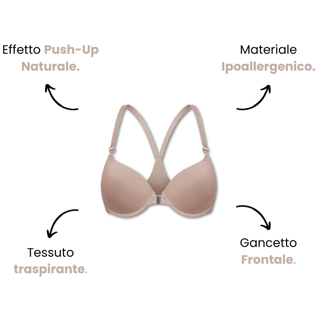 La chiusura frontale, unica nel suo genere, elimina il fastidio dei gancetti e delle spalline, facilitando l'utilizzo e offrendo una vestibilità uniforme e comoda.